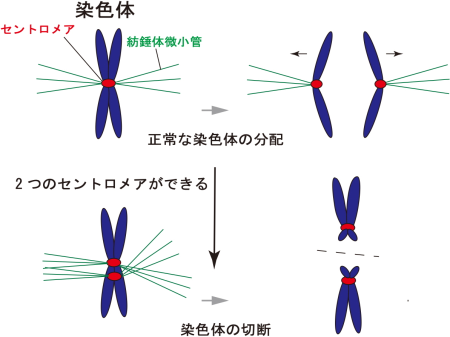 正常な細胞ではセントロメア上に集合するタンパク質複合体(動原体)と細胞の両極から伸びた微小管が結合して、染色体の分配がおきます(図1上)。もし、セントロメアが染色体上に2箇所以上できると、微小管が均等に染色体を牽引できず、染色体の切断が起こります(図1下)。