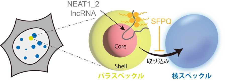 図1.NEAT1 architectural RNAによるパラスペックルの形成と独立性維持