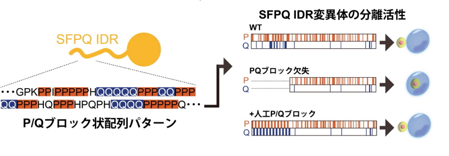- パラスペックル表面領域に存在するSFPQ内IDRの「P/Qブロック状配列パターン」が核スペックルからの分離に必要。