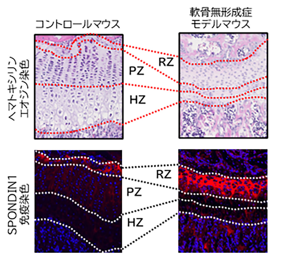 本研究にて、CREB活性のマーカーとしてSPONDIN1を発見した。モデルマウスの静止層は幅が増大し、SPONDIN1を高発現していた、即ちCREBが活性化していた。 RZ, 静止層; PZ, 増殖層; HZ, 肥大層
