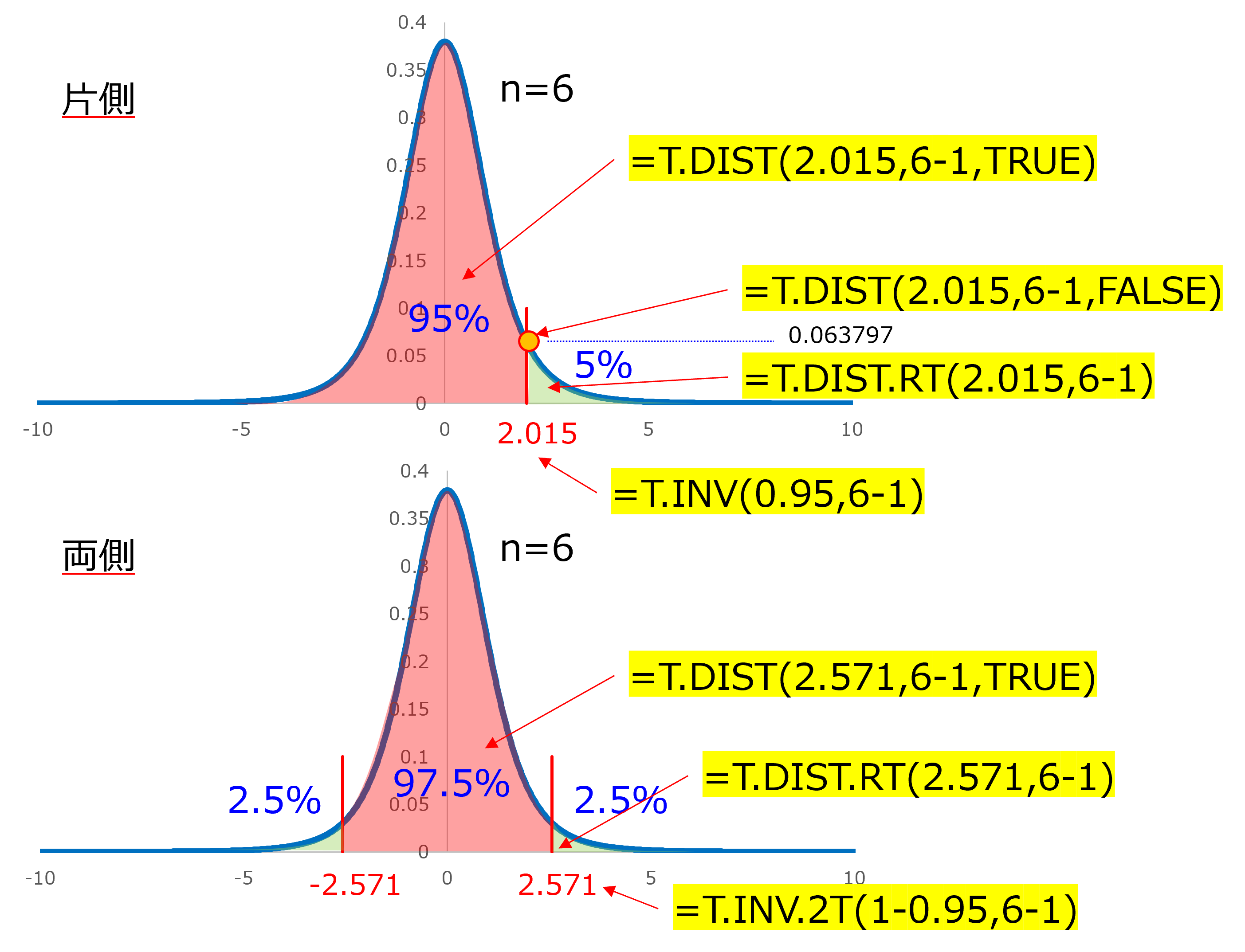 ・T.DIST.2T(t値, 自由度, TRUE) : t分布(自由度n-1)の両側累積分布関数 : -tから,t値まで
